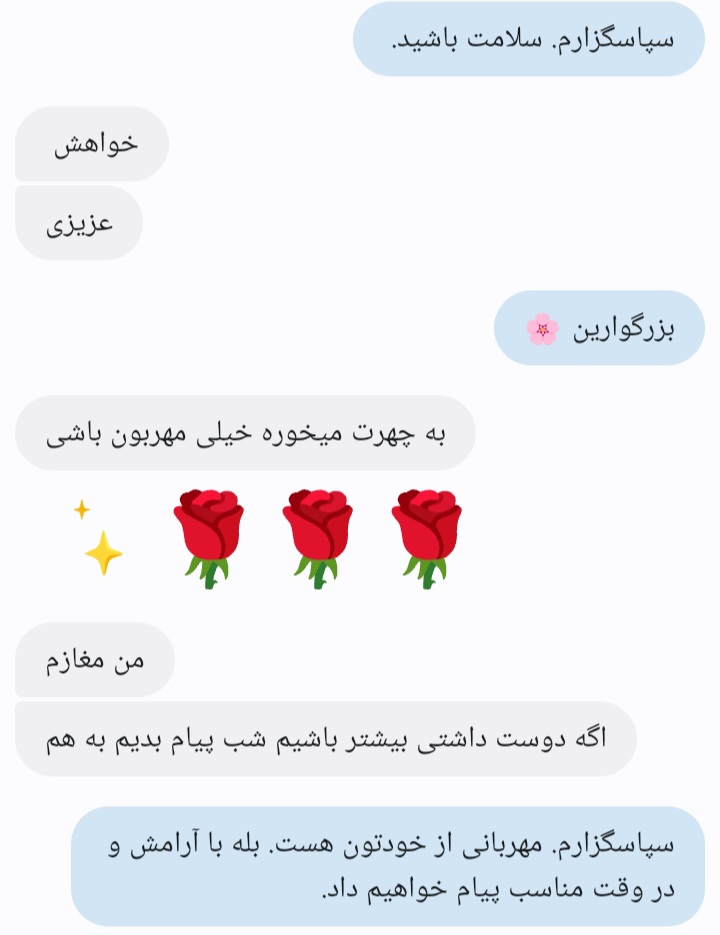 ● ردفلگ بعدیش: احتمالن خیلی از حرفاش بدون صداقت بودن... ساعت خواب متناقض شب اول و دومش مشخص کننده و گویاس... البته شب دوم من هیچ پیامی ندادم و ۱۱ شب بیهوش بودم از خستگی😁 پس ردفلگ بعدی: وقتی میگه با کسی نیس، برا رفیقاش تا بوق سگ بیدار مونده؟ رفیقبازه! اگه رفیقاش نبودن پس سینگل نیس و یه استخر بزرگ آبنمک داره 😁 وقتی هم اول ب بسمالله میگه شما به نظرم خیلی مهربونین، دوپهلوئه، اول آشنایی گاهی اعلام نظر ینی : توقع دارم اونجوری( خیلی مهربون) باشی! یا میخواد ببینه چه جوابی میدی و سریع خر میشی؟... خدای عزیزدلم برای اینکه آگاهم کردی سپاسگزارم💜🤌😍